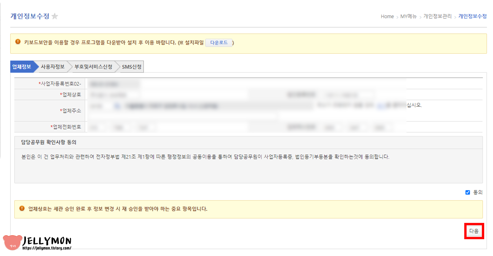 2. 개인정보 수정의 [업체정보] 화면에서 다음 - [사용자정보] 화면에서도 다음 눌러주세요.