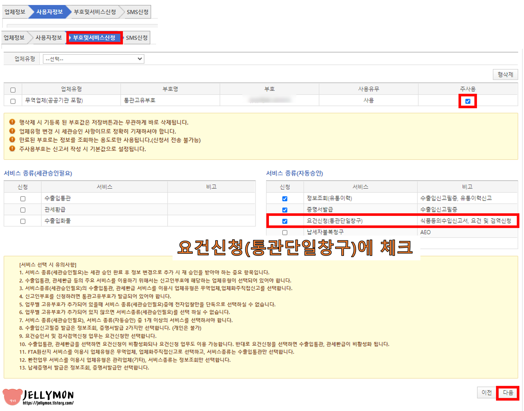 그 후 아래 서비스 종류란의 요건신청(통관단일창구) 체크박스 선택하고 다음 눌러주세요.