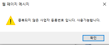 그래서 혹시 몰라 인터넷 익스플로우로 접속했더니 중복되지 않은 사업자 등록번호라고 저렇게 뜨네요.