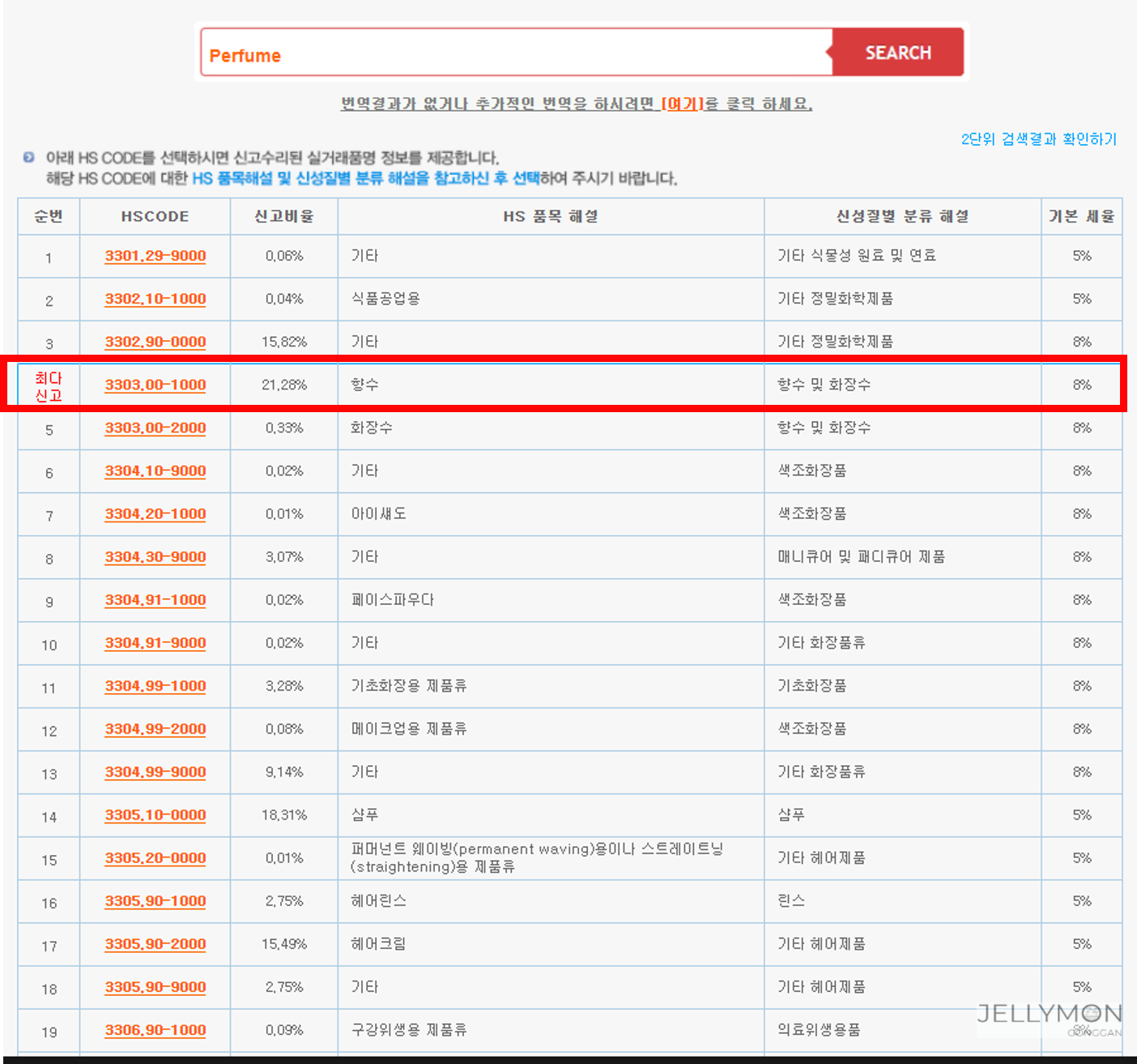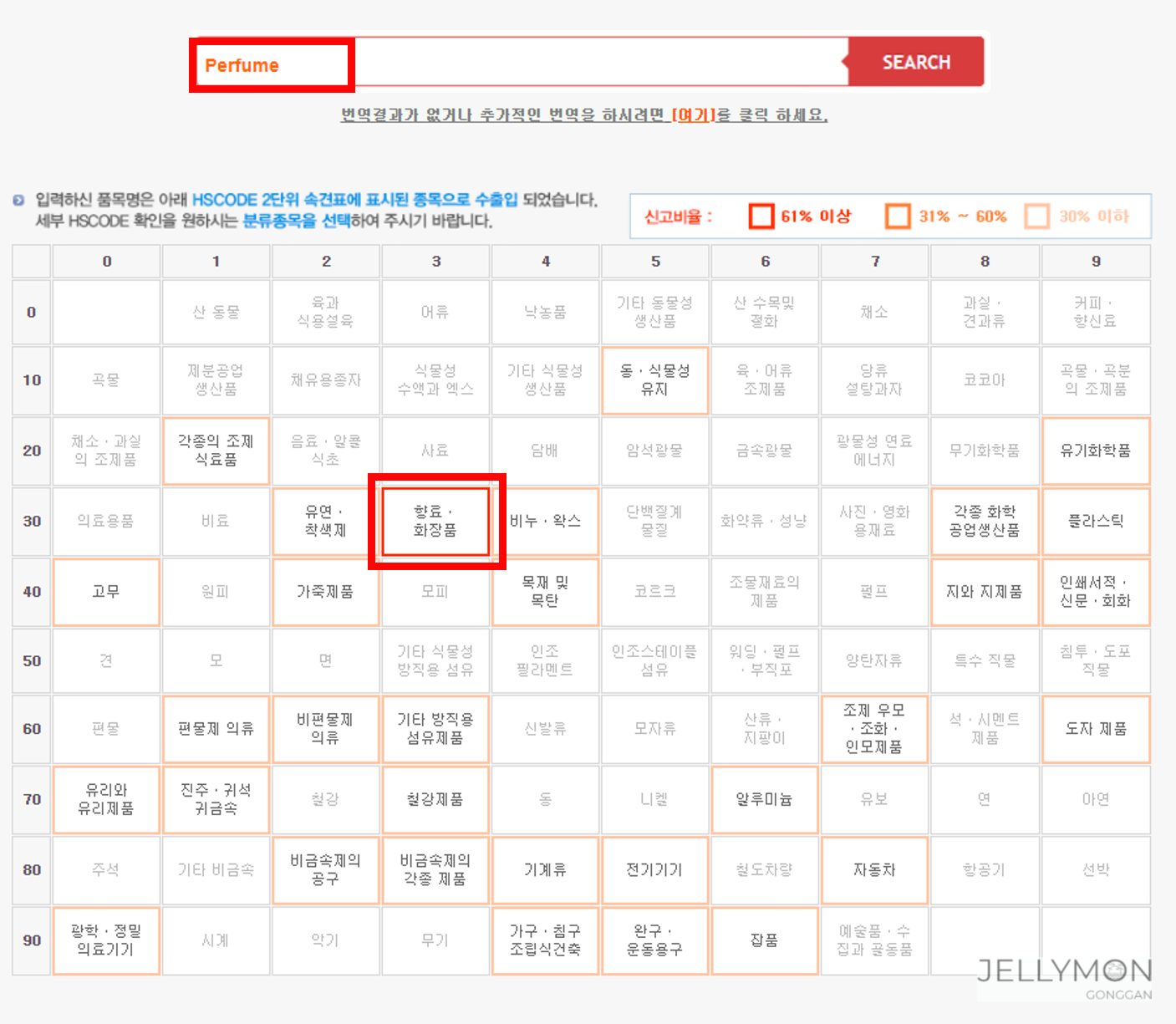향수를 입력했더니 'Perfume'으로 번역되어 나옵니다. 또한 61% 이상 신고된 분류 종목이 표시되어 사람들이 어떤 종목으로 신고를 많이 했는지 한 눈으로 볼 수 있어 편리합니다.